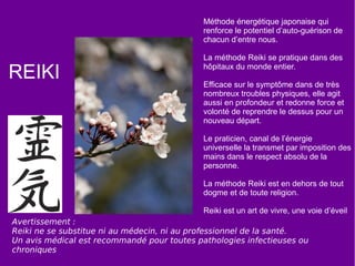 Le document présente la méthode Reiki, une approche énergétique japonaise qui favorise l'auto-guérison et aide les individus à retrouver confiance et autonomie. Elle est pratiquée dans des hôpitaux à travers le monde et vise à traiter divers troubles physiques tout en étant en dehors de tout dogme religieux. Le Reiki ne remplace pas les soins médicaux, et un avis médical est recommandé pour les pathologies graves.