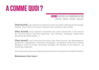 Acomz est une agence de communication spécialisée dans l'identité, le digital, l'édition et la publicité, offrant une gamme complète d'outils de communication tels que le design graphique, la création de sites web et des campagnes publicitaires. L'équipe, composée de divers professionnels passionnés, collabore avec les clients pour développer des stratégies de communication sur mesure. Acomz se positionne également comme un partenaire média pour accroître la visibilité des clients tout en intégrant des pratiques innovantes.