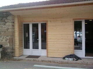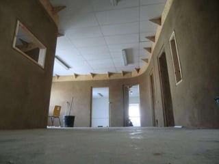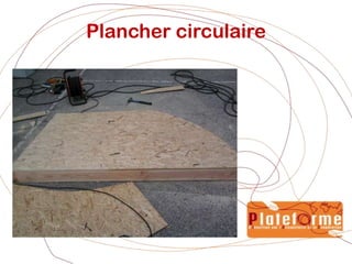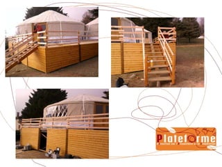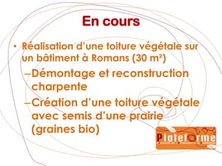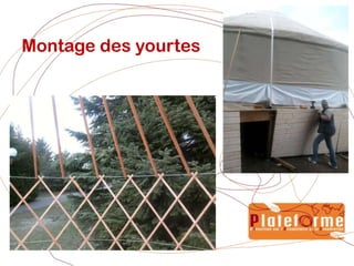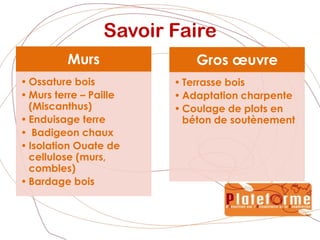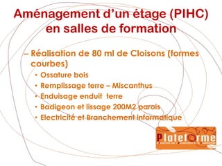 Le document décrit plusieurs projets de construction et d'aménagement, notamment des travaux de bardage en bois, la création d'une terrasse circulaire pour accueillir des yourtes, et l'aménagement de salles de formation. Il mentionne également la réalisation de cloisons, d'isolation, ainsi que la création d'une toiture végétale sur différents bâtiments. Ces travaux incluent des techniques écologiques comme l'utilisation de ouate de cellulose et de semences bio pour la végétalisation.