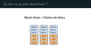 Le document explique le fonctionnement de la blockchain, en décrivant la structure des blocs, le processus de minage et les transactions associées. Il distingue les blockchains comme Bitcoin et Ethereum, abordant leurs spécificités comme les adresses, les sorties de transactions non dépensées (UTXO) et le concept de comptes dans Ethereum. Le document évoque également des aspects tels que la programmation et des projets comme The DAO dans l'univers d'Ethereum.