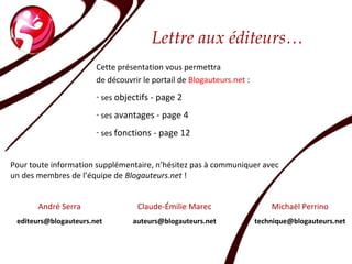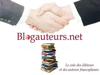 Le document présente le portail blogauteurs.net, visant à créer une communauté d'auteurs francophones et à offrir des outils de diffusion et de vente sécurisés pour leurs ouvrages. Il détaille les avantages pour les auteurs et éditeurs, tels que la création de blogues individuels, une visibilité accrue, et un support technique. Enfin, il aborde les options de vente pour les livres en version imprimée et numérique, ainsi que la sécurité juridique des fichiers partagés.