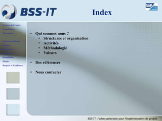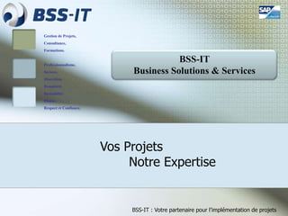BSS-IT est une société de conseils spécialisée dans la gestion de projets SAP, active principalement en Belgique et en France. Elle offre des services de conseil, formation, mise en œuvre et support, tout en mettant l'accent sur la qualité, la rentabilité et la satisfaction des utilisateurs. Grâce à une équipe de consultants qualifiés, BSS-IT s'engage à simplifier l'implémentation des solutions informatiques en favorisant l'adhésion des utilisateurs et le respect des délais et budgets.