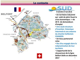Le projet Chacasol, créé en 2012, vise à favoriser l'insertion sociale et professionnelle des personnes éloignées de l'emploi à travers des services variés en gare de Delle, cofinancé par le Fonds Social Européen. Avec une équipe de directeurs et d'encadrants techniques, le chantier a intégré 25 personnes depuis son ouverture, offrant des solutions d'emploi ou de formation à 40% de ses salariés. Le bilan social montre une diversification de l'emploi et un engagement fort des partenaires locaux pour la redynamisation du territoire industriel face à une forte crise économique.