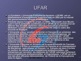 L'Université Française en Arménie (UFAR) offre une formation en français et en disciplines spécialisées, préparant des diplômés pour les exigences du marché arménien tout en renforçant les relations avec la France et l'Europe. La chaire de français de l'UFAR met en œuvre des méthodes d'enseignement modernes et interactives, visant à développer des compétences linguistiques et culturelles chez les étudiants. L'université est reconnue pour son approche innovante et son implication dans la francophonie dans la région du Caucase.