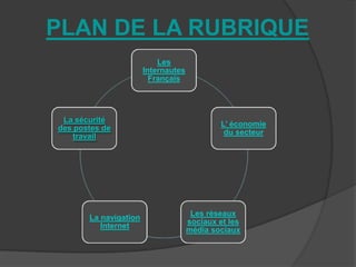 Le document présente des données sur l'utilisation d'Internet en France, soulignant que 40,24 millions de Français sont internautes en janvier 2012, avec une majorité ayant entre 11 et 50 ans. Il aborde aussi les classements des fournisseurs d'accès et des sites les plus visités, ainsi que l'impact économique du secteur Internet sur le PIB. Enfin, le document fournit des statistiques sur les réseaux sociaux, la navigation web et la sécurité des postes de travail.