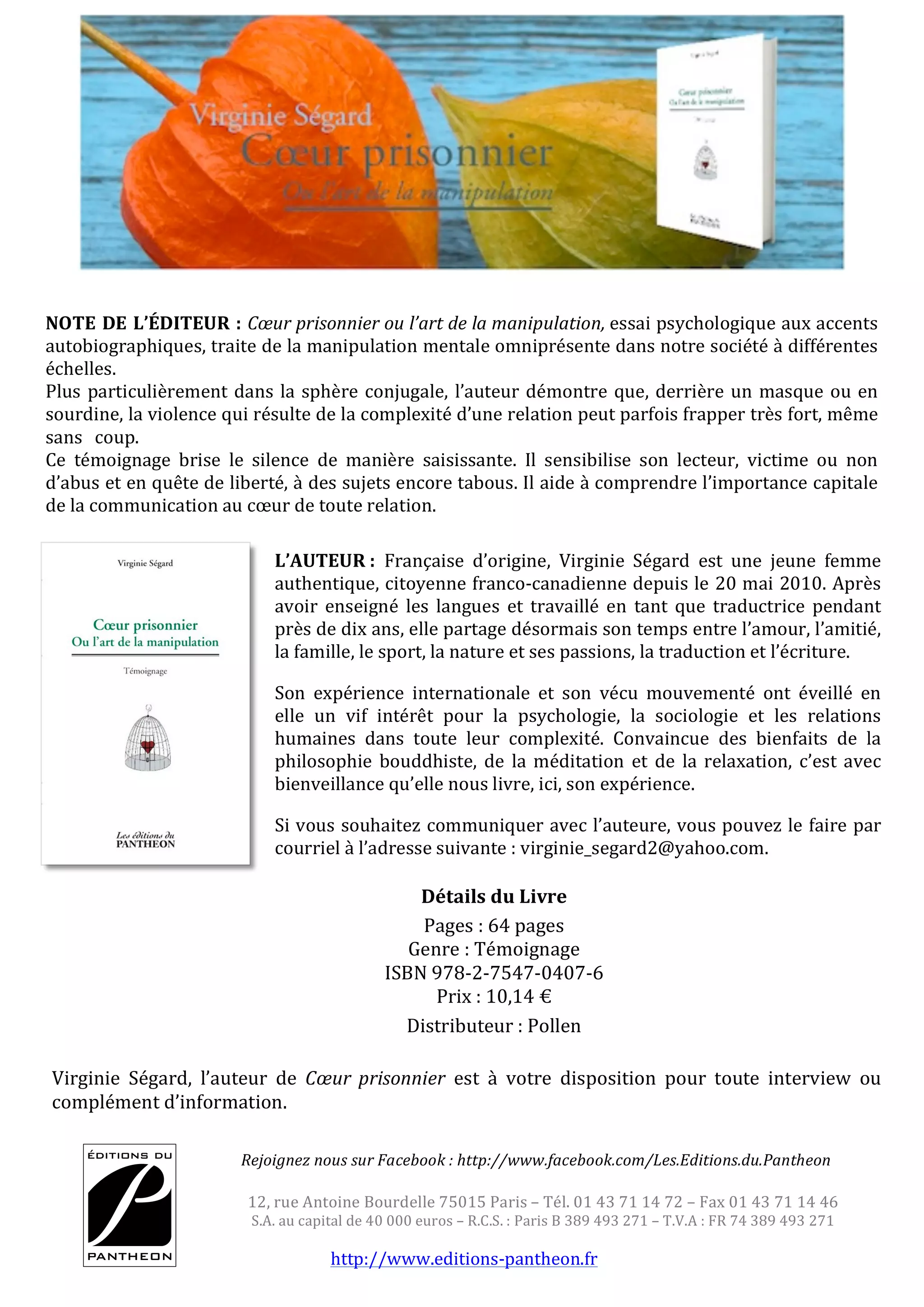 Cœur prisonnier, un essai psychologique de Virginie Ségard, explore la manipulation mentale dans les relations, en mettant en lumière la violence subtile qui peut s'y manifester. L'auteure, forte de son expérience personnelle et de son intérêt pour la psychologie, sensibilise les lecteurs à des questions encore tabous tout en soulignant l'importance de la communication. Le livre, qui fait 64 pages, se présente comme un témoignage authentique sur des sujets essentiels.