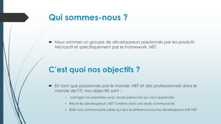 La communauté tunisienne .net, fondée par Mme Reabi Hamida et M. Bouchiba Atef, vise à rassembler des développeurs passionnés par le framework .net et à former des étudiants en offrant des formations gratuites et des ressources. Les objectifs incluent le partage d'expertise, le soutien des étudiants durant leurs projets académiques, et l'organisation d'événements pour les développeurs asp.net. Ils cherchent également un partenariat avec Intilaq pour fournir un espace de travail et soutenir leurs activités.