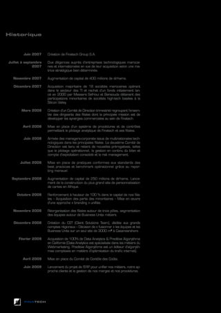 Finatech Group S.A., créé en 2007, a rapidement acquis 18 sociétés marocaines pour se développer dans le secteur des technologies de l'information, structurant ses opérations autour de trois pôles principaux. En 2008, l'entreprise a renforcé sa gouvernance et mis en place des pratiques de synergie et de contrôle pour optimiser ses performances. Finatech vise à devenir un acteur majeur sur le marché mondial grâce à ses compétences variées et ses partenariats stratégiques.