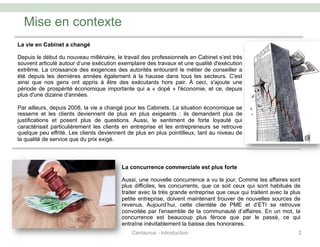 Le document traite des évolutions et défis auxquels sont confrontés les cabinets de services conseils, avec une montée des attentes des clients et une concurrence accrue. Il souligne l'importance d'adapter la gestion et la stratégie, en intégrant les différentes générations au sein des équipes professionnelles. Centaurus se positionne comme une firme spécialisée pour aider ces cabinets à naviguer ces changements complexes et à améliorer leurs compétences en stratégie, mobilisation et leadership.