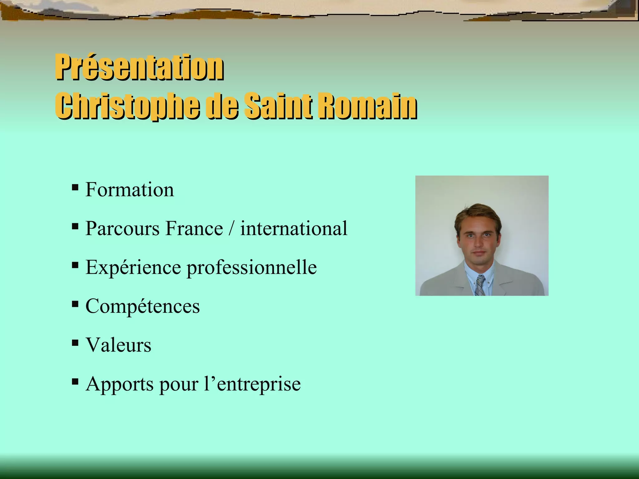 Christophe de Saint Romain est un professionnel avec une formation en tourisme et en action commerciale, ainsi qu'une expérience diversifiée en immobilier et en gestion d'équipe. Son parcours comprend des postes de négociateur immobilier et de manager des ventes, tant en France qu'à l'international, notamment aux États-Unis et au Costa Rica. Il possède de nombreuses compétences en vente, maintenance de bateaux, et management, et adhère à des valeurs telles que la sincérité et l'esprit d'équipe.