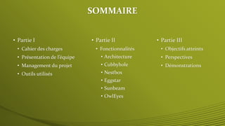 Le document présente un projet de mise en place d'un service de stockage en ligne pour Cumorah Interactive, incluant la description des fonctionnalités, l'architecture technique et la gestion de projet. Les objectifs atteints incluent un site vitrine fonctionnel, un explorateur de fichiers et une application mobile en prototype. Des perspectives d'amélioration et de développement futur sont également évoquées.