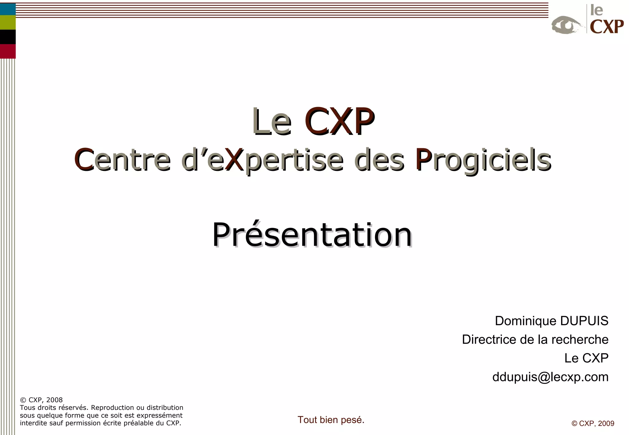 Le CXP est un centre d'expertise en progiciels qui accompagne les entreprises dans l'amélioration de leur système d'information et la maximisation de leurs investissements informatiques. Il propose des études de marché, des évaluations de solutions et des services de consulting pour aider les professionnels à faire des choix éclairés. Créé en 1973, le CXP s'adresse aussi bien aux utilisateurs qu'aux éditeurs et intégrateurs pour répondre aux exigences croissantes du secteur.