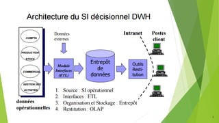 Le document présente le rôle des interfaces ETL dans la gestion des données, en décrivant le processus d'extraction, transformation et chargement des données. Il traite des modalités d'extraction des données en mode différé et temps réel, ainsi que des considérations pour le chargement des données dans un entrepôt. Enfin, il souligne l'importance d'assurer la qualité des données et de planifier le processus de chargement.