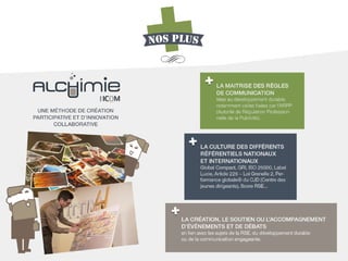 Le document présente l'agence ICOM 21, se concentrant sur le développement durable et la communication responsable. Fondée en 1985, l'agence est composée de 30 collaborateurs et a un capital social de 117 504 euros. Son objectif principal est d'accompagner ceux qui forgent le monde de demain.