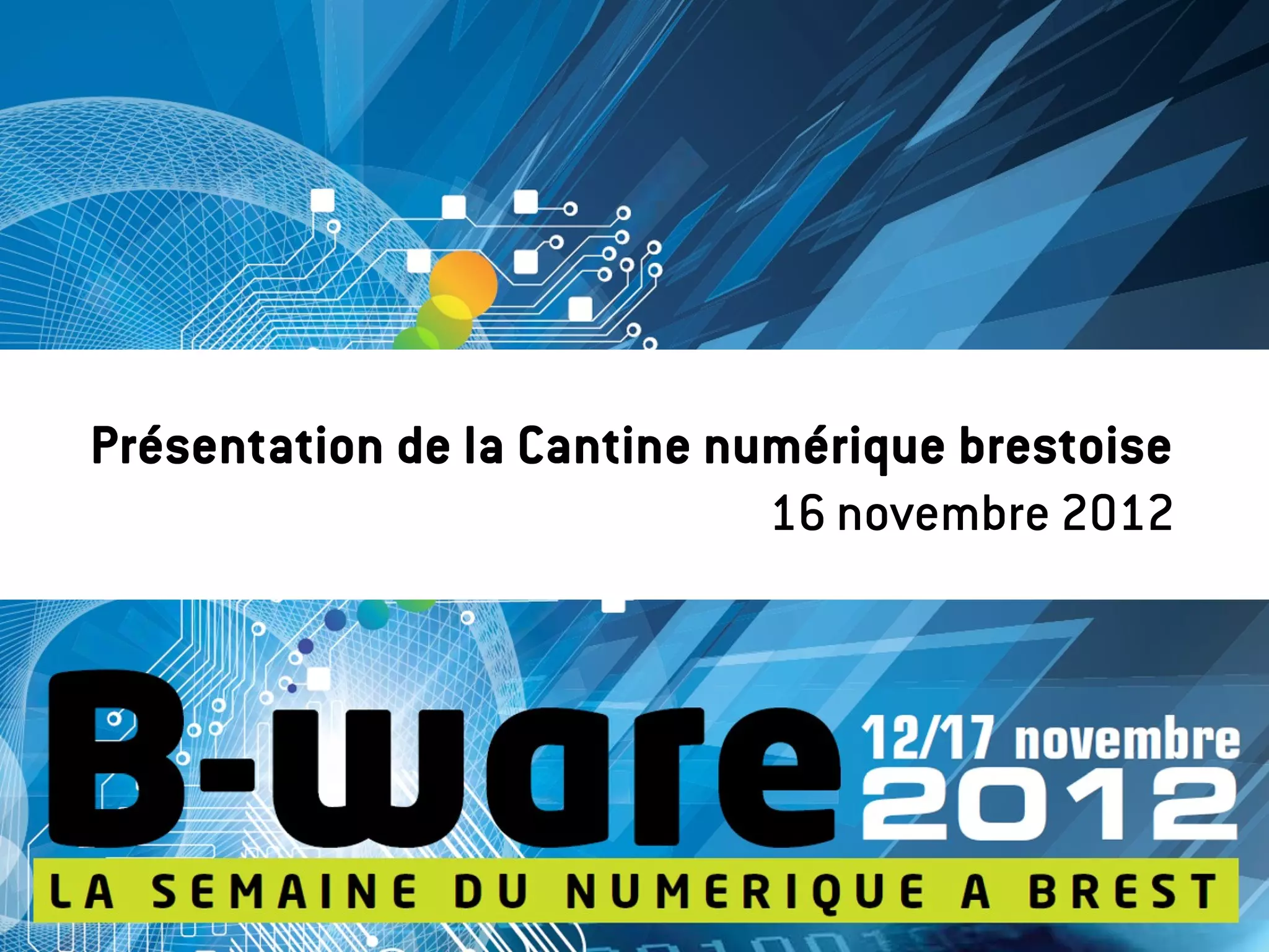 La cantine numérique brestoise est un tiers-lieu favorisant l'innovation et les échanges entre entrepreneurs, développeurs et chercheurs, offrant divers espaces de travail et d'événements. Elle se situe au cœur d'un territoire dynamique et vise à créer des opportunités tout en intégrant des valeurs de collaboration et d'ouverture. Le projet, soutenu par de nombreux partenaires, devrait inaugurer ses locaux en février 2013.