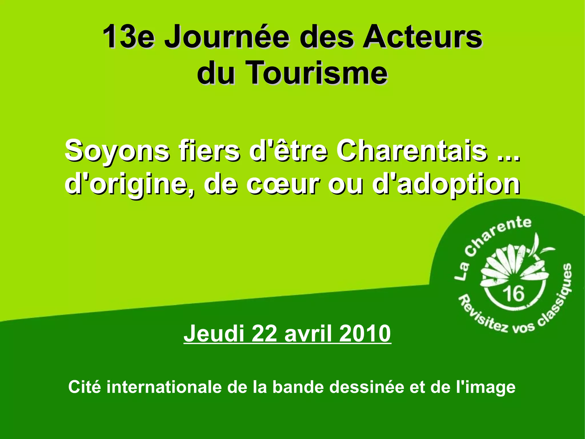 La 13e journée des acteurs du tourisme s'est tenue le 22 avril 2010 à la cité internationale de la bande dessinée et de l'image à Angoulême. L'événement a été accueilli par Philippe Lavaud, maire d'Angoulême, et a présenté la cité par Gilles Ciment, directeur général. L'accent a été mis sur la fierté d'être Charentais, qu'on y soit d'origine, de cœur ou d'adoption.