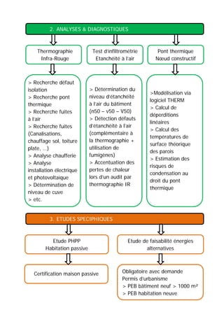 Lannot Consulting SPRL offre des services de performance énergétique des bâtiments, incluant certificats énergétiques, audits énergétiques et conseils pour améliorer l'efficacité énergétique. Ils réalisent des analyses et diagnostics thermiques approfondis, comme la thermographie infrarouge et les tests d'infiltrométrie, pour identifier les défauts d'isolation et les fuites d'air. Des études spécifiques, telles que la certification pour maisons passives et l'évaluation des énergies alternatives, sont également proposées.