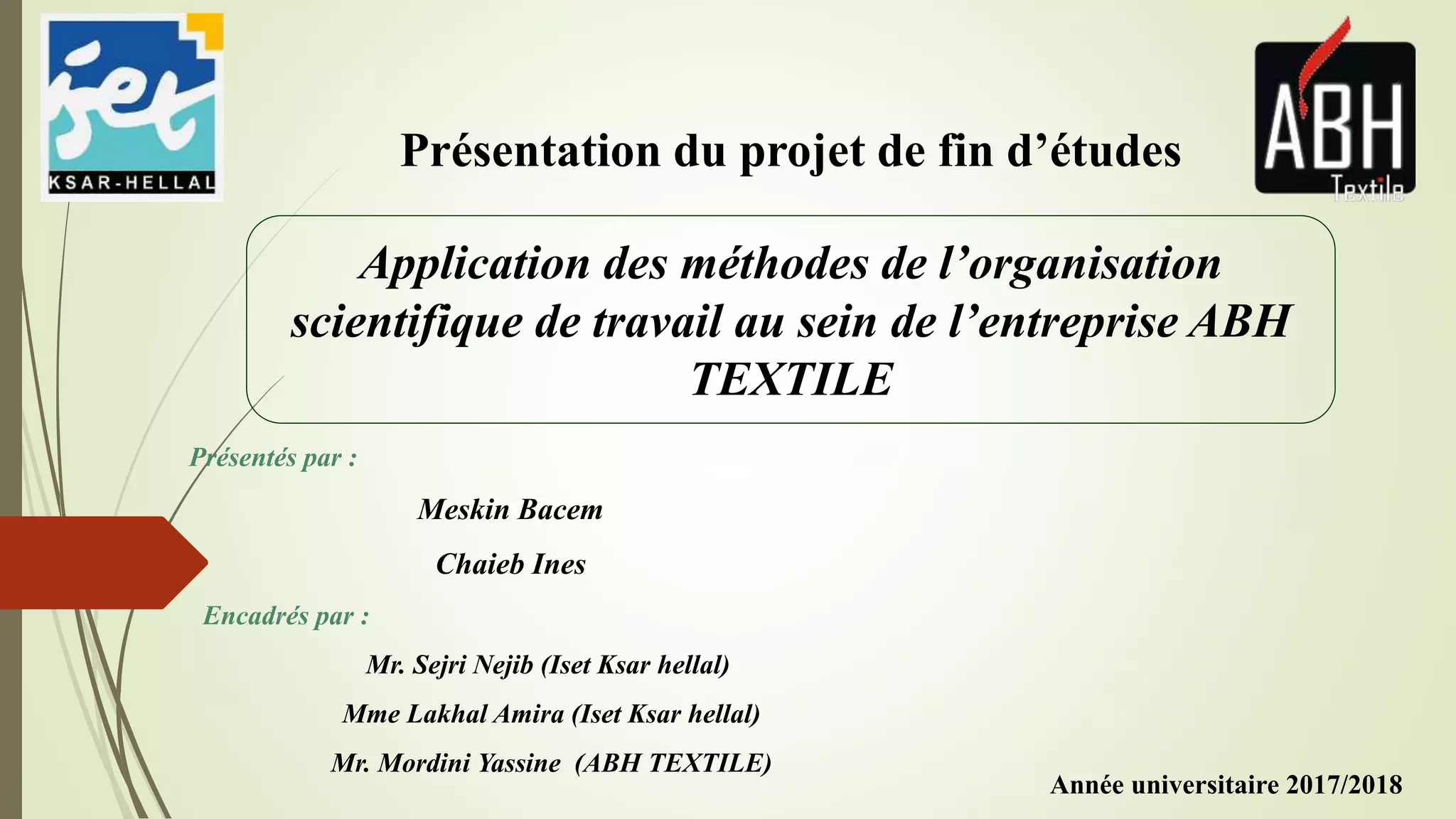 Ce projet de fin d'études vise à améliorer l'organisation du travail dans l'entreprise ABH Textile en appliquant des méthodes scientifiques. Il présente un diagnostic de l'état actuel de la production, propose un plan d'actions et aboutit à la création d'un outil informatique pour optimiser le suivi de la production et réduire le temps des opérations. Les résultats attendus incluent une meilleure efficacité et une gestion améliorée des ressources humaines et matérielles.