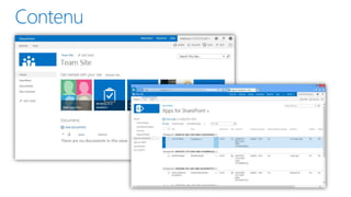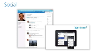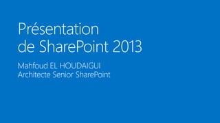 Le document présente SharePoint 2013, en mettant l'accent sur ses workflows, son contenu social et son expérience utilisateur. Il mentionne également des fonctionnalités liées à la recherche et à l'intelligence d'affaires, ainsi que l'intégration de Yammer comme réseau social d'entreprise. Les liens vers des pages spécifiques d'exemples d'utilisation sont fournis.