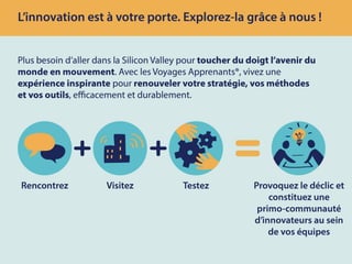 Pour en savoir plus sur les Voyages Apprenants, dispositif qui provoque le déclic de vos équipes par un parcours immersif d'acculturation à l'innovation. Développé par Marine Ulrich et Orianne Ledroit