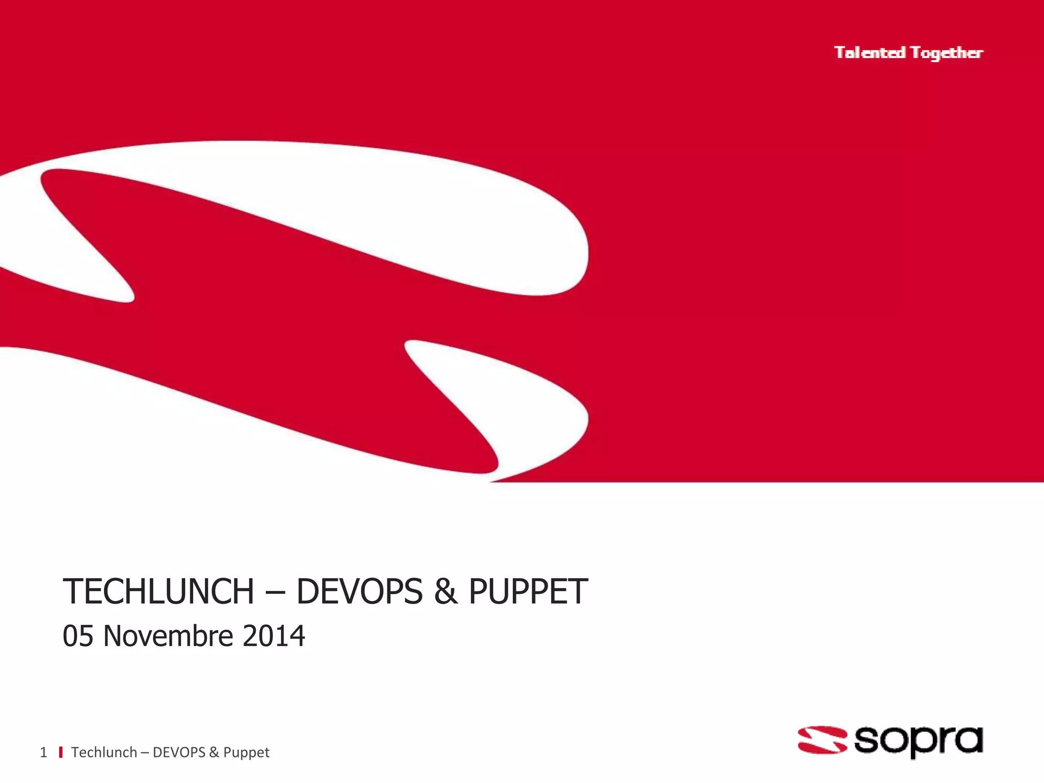 Le document présente une synthèse sur le concept de DevOps, soulignant l'importance de la coopération entre les équipes de développement et d'exploitation pour améliorer l'efficacité des processus. Il introduit également Puppet, un outil de gestion de configuration permettant l'automatisation des déploiements et la gestion des systèmes. Enfin, le document aborde les bonnes pratiques et les outils liés à l'industrialisation des projets, notamment Jenkins et l'intégration continue.