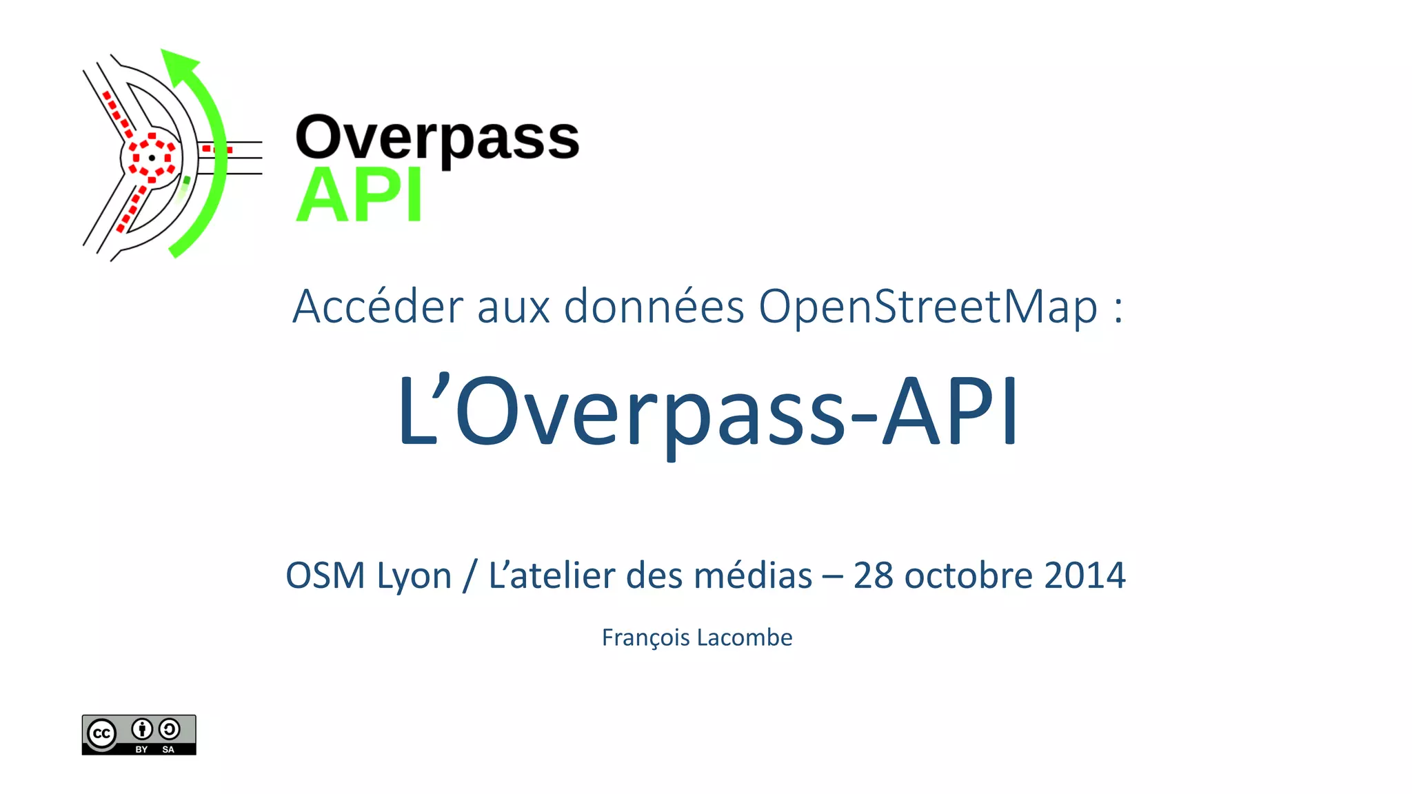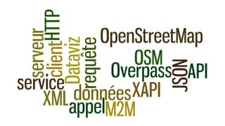 Le document présente l'utilisation de l'Overpass API pour accéder aux données OpenStreetMap, en détaillant le processus de formulation et d'envoi de requêtes. Il mentionne également la plateforme Overpass Turbo comme un outil utile pour visualiser des données et créer des requêtes facilement. Des liens vers des ressources supplémentaires, y compris la documentation, sont fournis pour guider les utilisateurs.