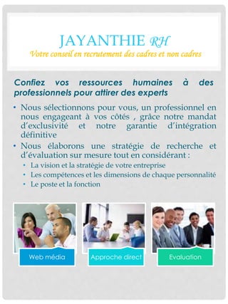 Jayanthie Consulting propose des services de conseil en ressources humaines pour le recrutement, la gestion de carrière, et le développement des compétences. L'entreprise s'engage à établir un partenariat efficient avec ses clients tout en offrant des solutions sur mesure pour la sélection et l'évaluation des talents. Fondée par Sandra Saint-Charles, l'agence mise sur une approche innovante et une équipe d'experts complémentaires pour optimiser la gestion des talents.
