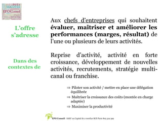 EPO Conseil propose une gamme de services de conseil en performance opérationnelle et stratégique pour les entreprises en croissance, en développement ou en reprise d'activité. L'entreprise aide les dirigeants à optimiser leurs performances (marges, résultats) en mettant en œuvre des solutions adaptées, tout en évaluant et maîtrisant les coûts. Leur méthodologie inclut l'audit, l'analyse des activités, la mise en place de processus et la formation des équipes pour garantir une amélioration durable des résultats.