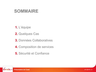Le projet COAST, dirigé par une équipe d'experts, se concentre sur la création de systèmes d'information collaboratifs fiables à grande échelle. Il vise à résoudre des problématiques telles que le partage sûr des données, la composition de services et la gestion de la confiance dans ces systèmes. Les questions scientifiques incluent l'efficacité du partage de données et les impacts des algorithmes sur les performances des services collaboratifs.