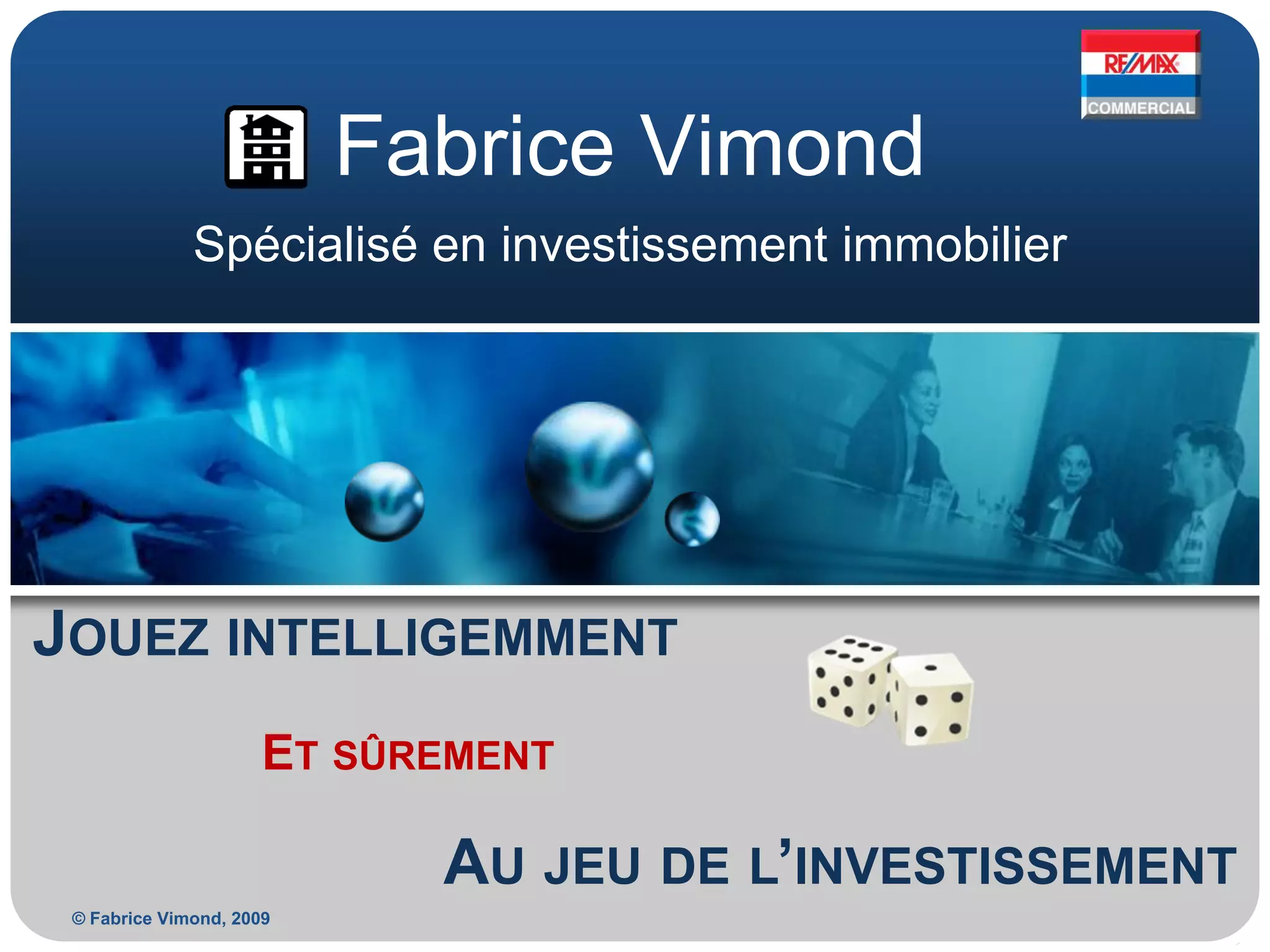 Fabrice Vimond est un expert en investissement immobilier avec une expérience de 12 ans dans la gestion immobilière et divers diplômes pertinents. Le document aborde des questions clés que les investisseurs doivent se poser et présente les avantages d'acquérir des immeubles à revenus, ainsi que les solutions offertes par Vimond pour optimiser l'achat et la vente. Il souligne également l'importance d'un service personnalisé et d'une stratégie efficace pour réussir dans le secteur immobilier.