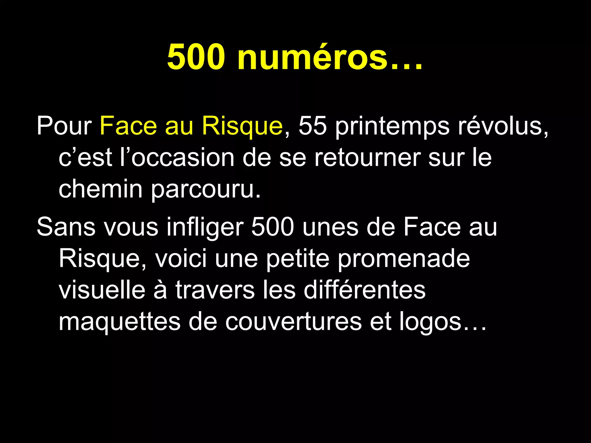 Le document retrace l'évolution du magazine 'Face au Risque' à travers ses 500 numéros, depuis ses débuts en 1956 jusqu'à 2014. Il met en lumière les changements de design, de formats et de contenus tout au long des décennies, illustrant un passage vers une communication plus moderne et rapide. Ce parcours est également une reconnaissance des collaborateurs qui ont contribué à son succès.