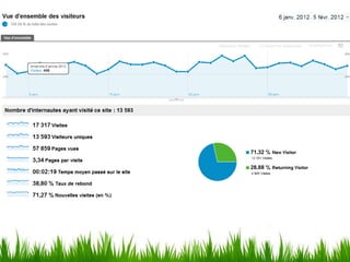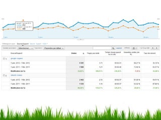 Le document présente une introduction à Google Analytics en soulignant son importance pour comprendre le comportement des visiteurs sur un site web. Il aborde des métriques essentielles telles que le taux de rebond, le temps passé sur le site, et l'origine du trafic, permettant ainsi d'optimiser la visibilité et d'évaluer l'impact des campagnes. Enfin, il mentionne des fonctionnalités avancées adaptées aux besoins variés, incluant le commerce électronique et l'analyse des pages.