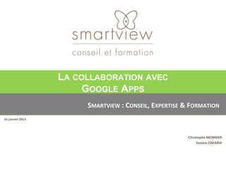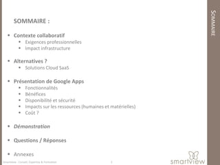 Le document présente Google Apps, une suite collaborative SaaS qui répond aux besoins d'une infrastructure collaborative moderne, incluant des fonctionnalités telles que la messagerie, le partage de documents et la gestion des contacts. Il met en avant les bénéfices de Google Apps en termes de productivité, de réduction des coûts et de sécurité des données, avec des statistiques sur son utilisation par plus de 5 millions d'entreprises. Des démonstrations des différentes fonctionnalités et une discussion sur les alternatives sont également incluses.