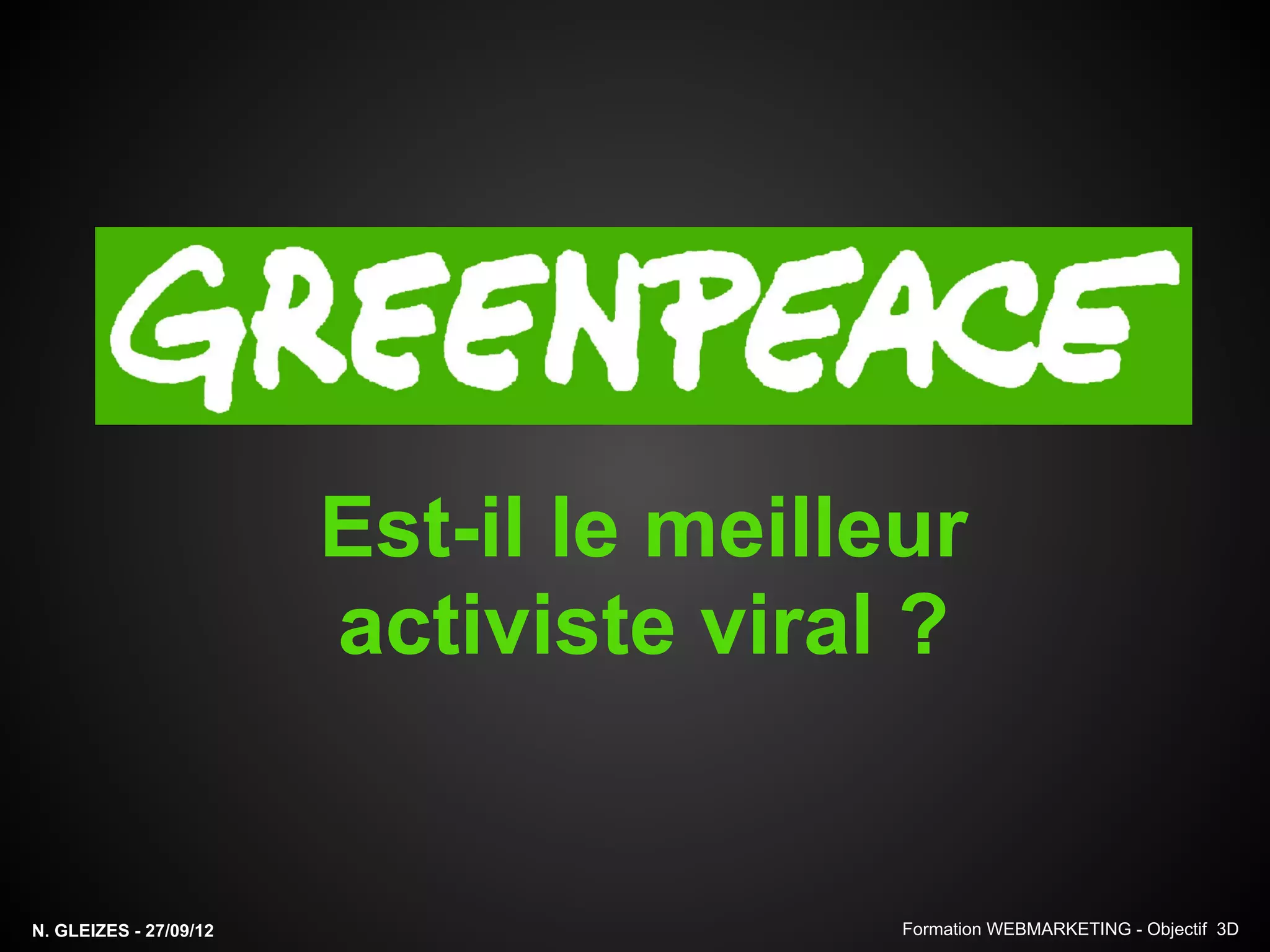 Le document présente Greenpeace comme un acteur majeur de l'activisme environnemental, fondé en 1971 avec plus de 3 millions d'adhérents dans le monde. Il décrit les stratégies de communication et les campagnes virales de Greenpeace, mettant en avant des exemples réussis comme celles concernant Mattel et Nestlé, qui ont conduit à des changements de politique chez ces entreprises. Enfin, il souligne l'utilisation d'outils numériques et de street marketing pour amplifier leur message et influencer l'opinion publique.