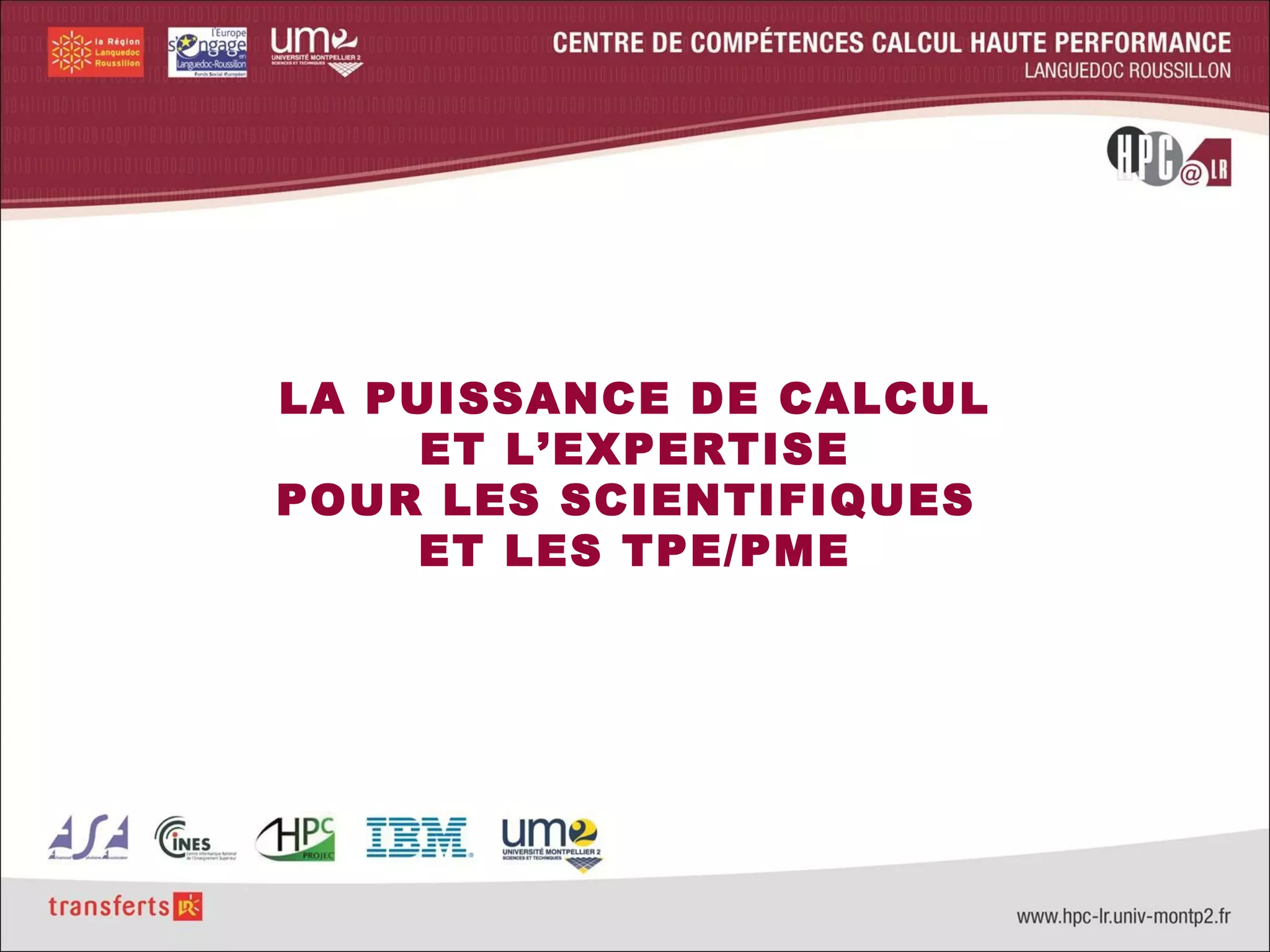 Le document présente un centre de calcul haute performance à l'université Montpellier 2, dédié à soutenir les scientifiques et les TPE/PME par le biais de services personnalisés, de formations et d'un supercalculateur hybride. Il mentionne des projets en cours et à venir dans le domaine TIC/santé, tels que l'assemblage du génome et la visualisation de protéines. Le centre favorise également la collaboration avec des institutions partenaires, notamment le Barcelona Supercomputing Center.