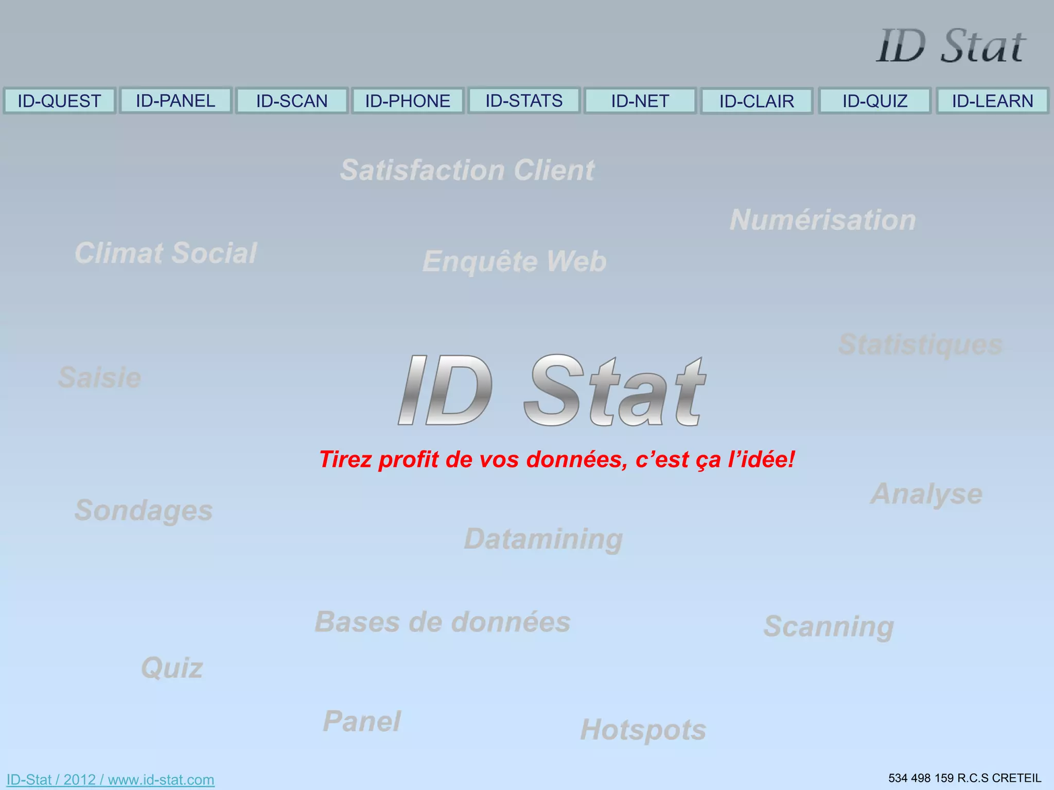 Le document présente les services offerts par ID-Stat, y compris la réalisation de questionnaires, la numérisation des enquêtes, et l'analyse des résultats. Il décrit également l'accès à des panels variés, les méthodologies de collecte de données et les tarifs assujettis pour chaque service proposé. Enfin, il inclut des informations de contact pour obtenir de l'aide ou des conseils concernant ces services.