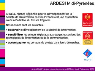 Ardesi est une agence régionale dédiée au développement de la société de l'information en Midi-Pyrénées, avec pour missions d'observer, sensibiliser et accompagner les acteurs dans leurs projets. Une analyse des sites d'offices de tourisme révèle des lacunes en visibilité, navigation, contenu et services, avec une exigence de mise à jour et des outils marketing souvent absents. Parmi les suggestions d'amélioration, il est proposé de mutualiser des ressources et d'établir des 'locomotives' régionales pour améliorer la qualité et la visibilité des sites.