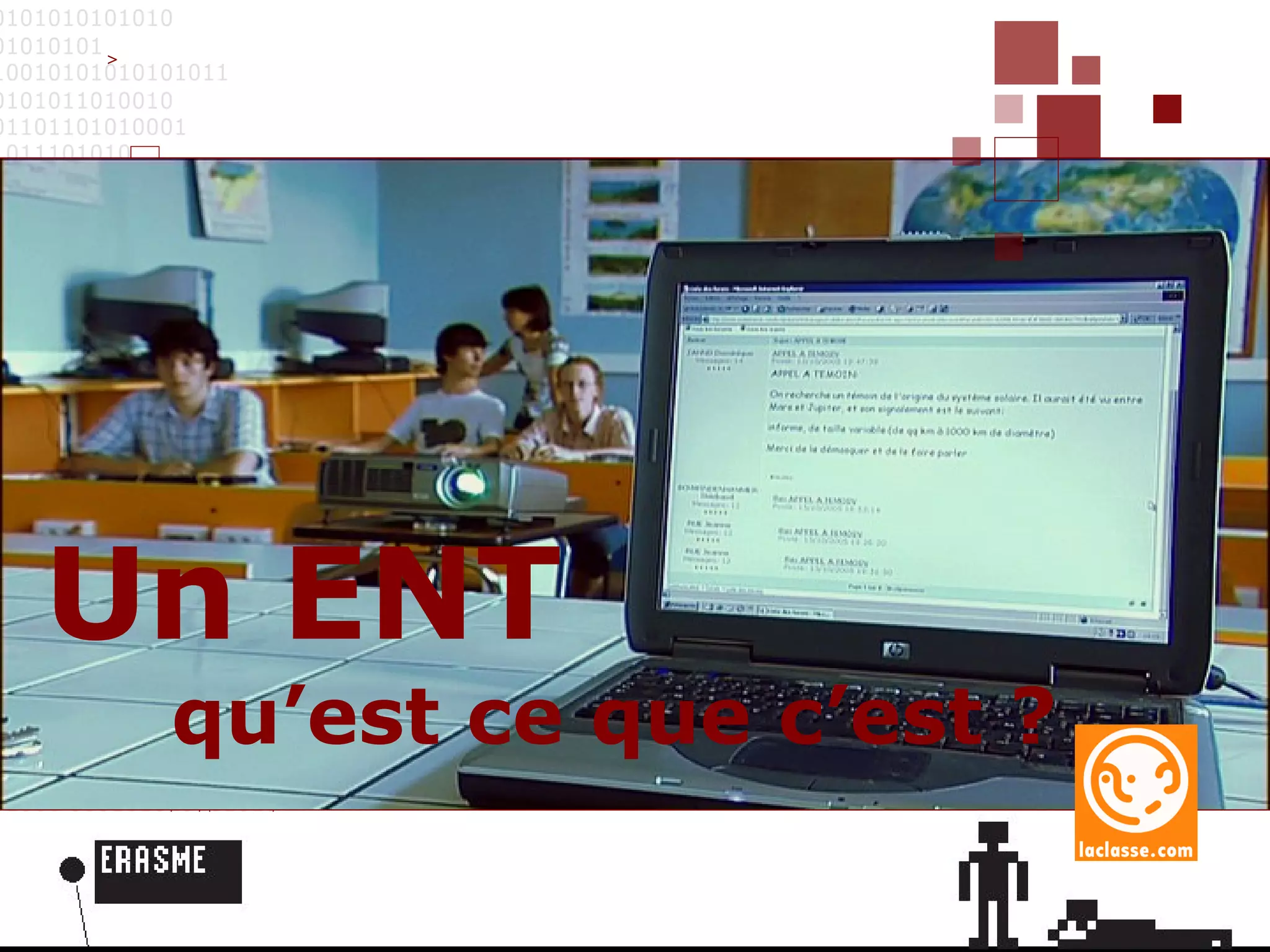Un ENT (Environnement Numérique de Travail) est un système d'information partagé pour les communautés éducatives, offrant un accès unifié aux ressources et outils de communication. Il permet une personnalisation des accès et favorise la collaboration entre élèves, enseignants et parents, tout en intégrant divers outils de gestion et d'interaction. L'ENT est géré par un administrateur local et peut être étendu à toute l'établissement selon les décisions du chef d'établissement.