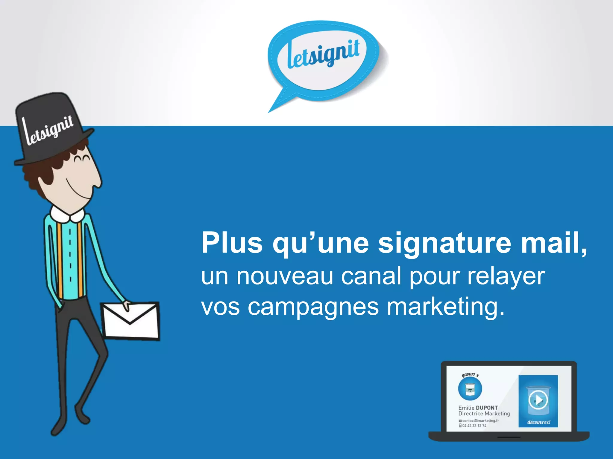 Letsignit est un outil qui transforme les signatures d'emails en un canal de communication marketing stratégique. Il permet de centraliser la gestion des signatures, de respecter l'identité de l'entreprise et d'intégrer des campagnes marketing interactives. En facilitant la personnalisation et le suivi des performances, Letsignit aide à maximiser l'impact des emails envoyés par les collaborateurs.