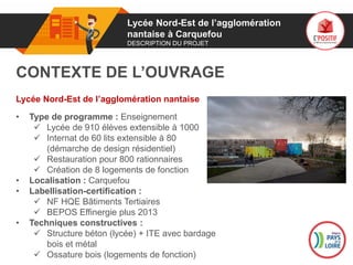 Le projet de construction du lycée nord-est de l’agglomération nantaise à Carquefou comprend un établissement scolaire pour 910 élèves, un internat et des logements de fonction, avec une certification NF HQE et un niveau de performance énergétique BEPOS Effinergie plus. La construction, réalisée par Sogea et d'une superficie totale de 11 549 m2, met l'accent sur l'écoconstruction avec des technologies avancées en matière de gestion des énergies renouvelables et de confort. La livraison a eu lieu en août 2017, après une durée de chantier de 23 mois, avec un coût global de 22,76 millions d'euros hors taxes.
