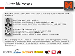 L'agence Markeyters est une société de conseil indépendante spécialisée en marketing, média et développement commercial, cofondée par Alexandre Gallier et Bruno Guillen. Elle accompagne ses clients dans des domaines tels que la stratégie commerciale, le développement commercial et la gestion de marques. Elle possède une forte expertise dans la diversification d'activités et le merchandising dans divers secteurs, notamment l'événementiel et le tourisme.