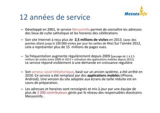 Le service messesinfo, lancé en 2001, permet aux utilisateurs de localiser les lieux de culte catholiques et d'accéder aux horaires des célébrations, ayant enregistré plus de 2,5 millions de visites en 2013. Depuis 2009, il connaît une augmentation régulière de sa fréquentation, soutenue par des applications mobiles et des mises à jour menées par 2000 contributeurs. Les futures améliorations incluent une interface utilisateur intuitive, la gestion des horaires au niveau des paroisses et de nouvelles fonctionnalités basées sur les demandes des internautes.