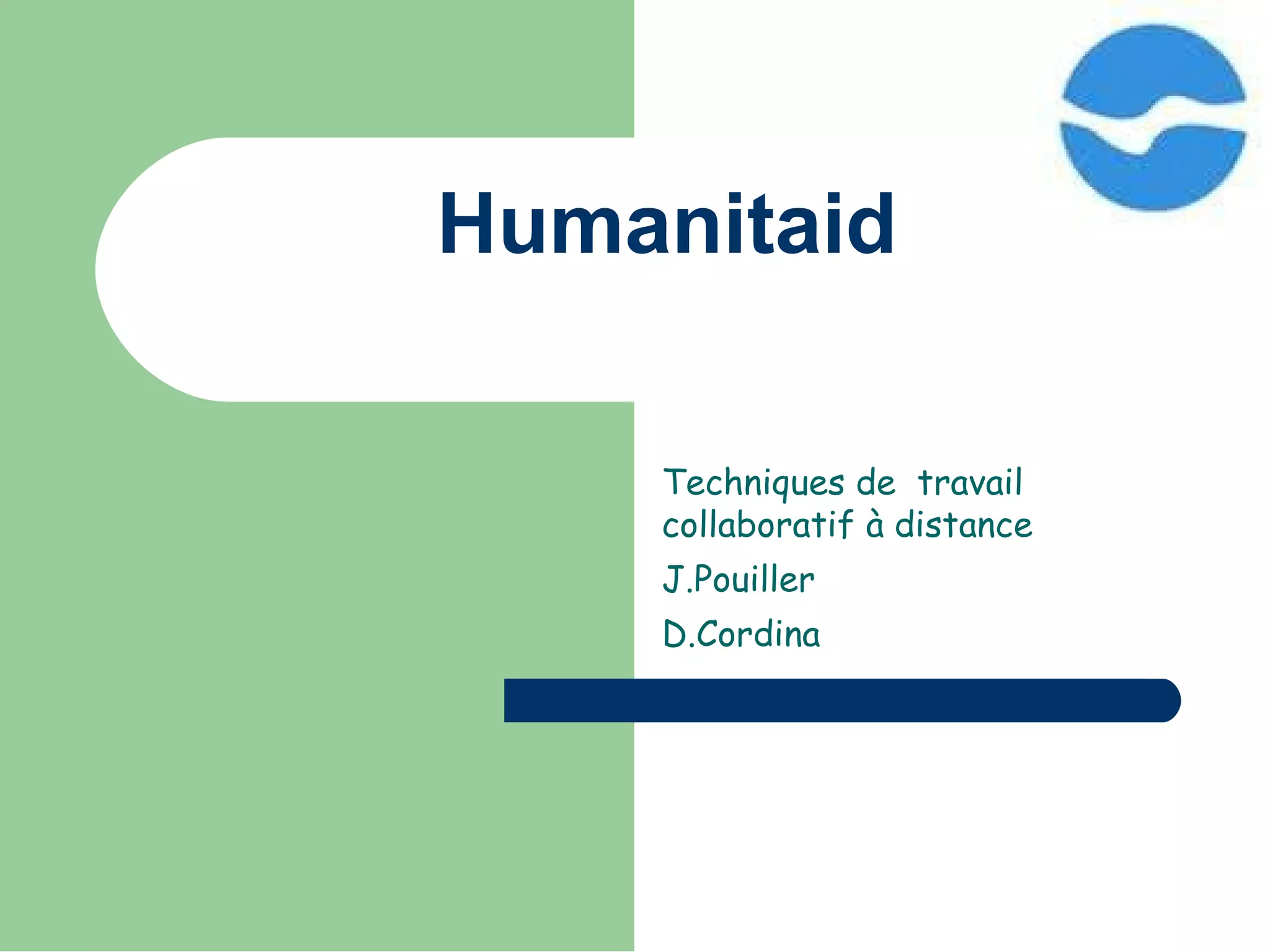Humanitaid est une association créée en 2007 qui met en relation des bénévoles avec des associations humanitaires via sa plateforme en ligne. Elle dispose de réseaux collaboratifs, notamment sur Facebook et Ning, pour engager ses membres et favoriser des interactions autour des missions et des événements. L'association vise à améliorer la visualisation des thématiques et à renforcer les liens entre les membres grâce à divers outils et activités.