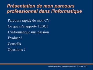 Olivier Dupont, IT Manager avec 20 ans d'expérience, présente son parcours professionnel dans le secteur de l'informatique, débutant par la programmation et le consulting et évoluant vers des rôles managériaux. Il partage des conseils sur l'importance de la formation continue, l'écoute des utilisateurs et l'acceptation d'apprendre des autres. Aujourd'hui, son travail combine des aspects techniques et managériaux, tout en restant passionné par son domaine.