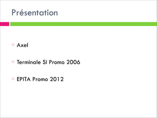 Le document présente le parcours d'Axel, diplômé d'EPITA en ingénierie web, mettant en avant la structure et les valeurs de l'école, fondée en 1984. Il décrit le cycle de formation avec une prépa classique et des projets pratiques durant les années d'études, suivi d'une spécialisation et d'expériences en entreprise. Axel évoque également ses compétences acquises et ses perspectives professionnelles, notamment en tant que lead développeur.