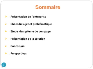 Le document présente un projet réalisé par Vivo Energy portant sur l'étude et l'automatisation du système de pompage d'additifs pour le stockage et la distribution de carburants. Il détaille la problématique liée à la santé et sécurité des ouvriers, les solutions techniques proposées, ainsi que les spécificités des pompes utilisées. Des perspectives d'amélioration et d'optimisation du processus d'additivation ainsi que des résultats techniques sont également abordés.