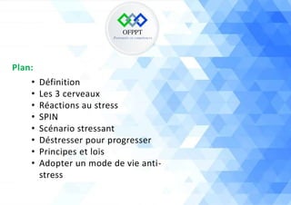 Le document aborde la gestion du stress, expliquant ses mécanismes à travers le modèle des trois cerveaux (émotif, instinctif, logique). Il décrit comment différentes situations, comme la prise de parole en public ou les examens, peuvent déclencher des réactions de stress et insiste sur l'importance d'adopter des attitudes anti-stress et de développer l'intelligence émotionnelle pour mieux gérer ces situations. Enfin, il souligne que la gestion du stress est une compétence acquise avec la pratique et qu'il est essentiel de mettre en place des habitudes positives.