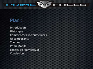 PrimeFaces est une bibliothèque open source de composants JSF qui facilite le développement d'interfaces web grâce à une intégration simple et à un ensemble riche de plus de 100 composants personnalisables. Bien que son évolution soit rapide et qu'il offre une légèreté appréciable, des problèmes de documentation et quelques bugs subsistent. PrimeFaces mobile permet également de créer des applications JSF optimisées pour les appareils mobiles sans configuration supplémentaire.