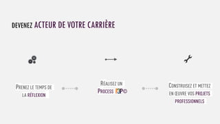 Le document présente un processus pour aider les individuals à devenir acteurs de leur carrière en se concentrant sur trois dimensions fondamentales : compétences, aptitudes et motivations. Un consultant utilise une méthodologie et des outils d'analyse pour accompagner le candidat dans la réflexion sur son projet professionnel, incluant des bilans de compétences et la préparation à des entretiens. Des témoignages montrent l'impact positif de cette démarche sur la clarté des perspectives professionnelles des participants.
