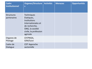 Le document décrit le cadre institutionnel et les organes impliqués dans la gestion des activités de suivi et d'évaluation, ainsi que les menaces et opportunités associées. Il mentionne la coordination au niveau national par des entités comme le secrétariat technique et implique divers partenaires tels que des institutions internationales et des ONG. Enfin, il souligne l'importance de la collaboration entre les différents acteurs du secteur agricole.
